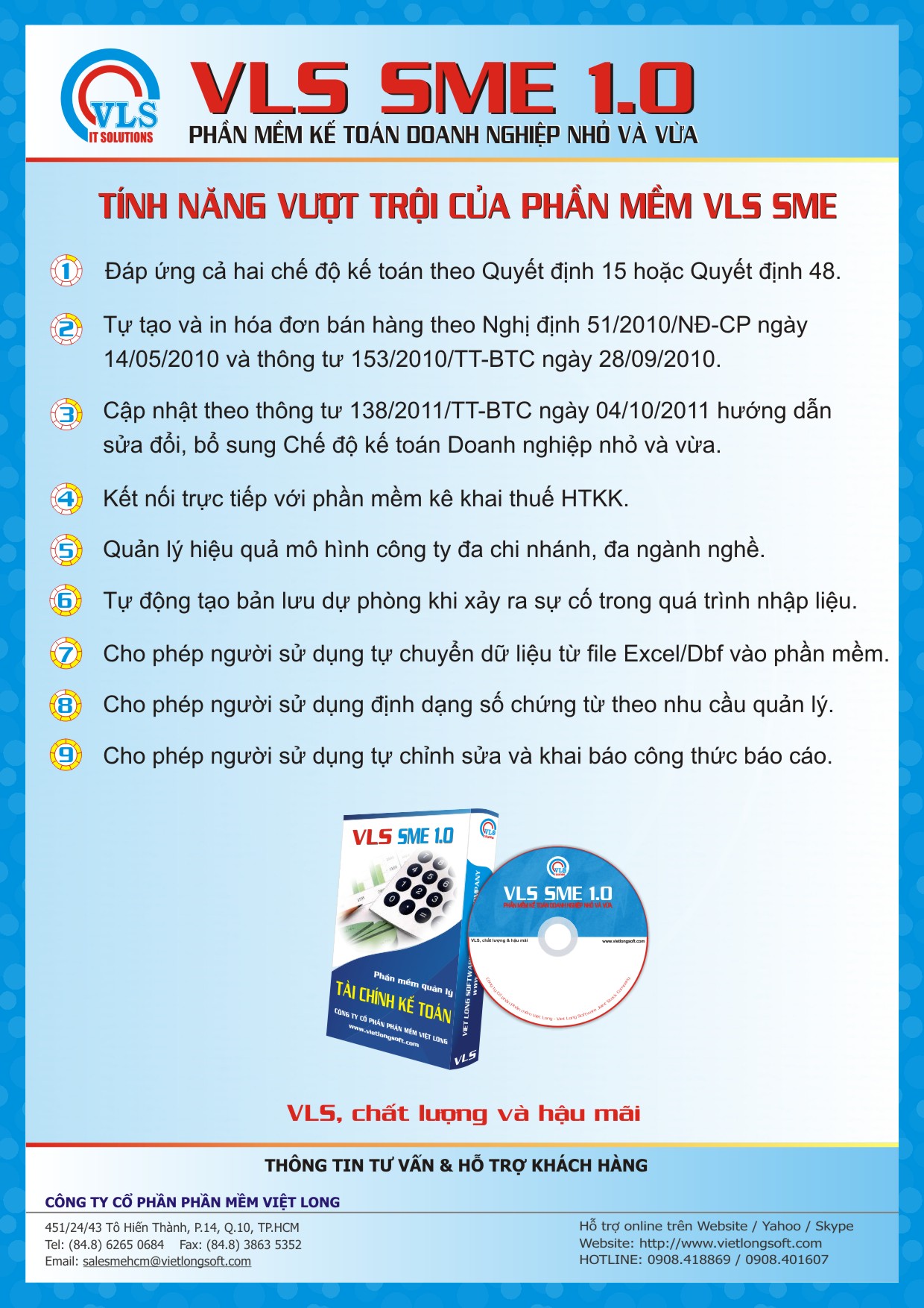 VLS SME 1.0 đáp ứng đầy đủ các sổ sách, báo cáo về tài chính, thuế theo quy định. Ngoài ra, còn đáp ứng đầy đủ những quy định về tiêu chuẩn phần mềm kế toán tại Thông tư 103/2005/TT-BTC ban hành ngày 24/11/2005.