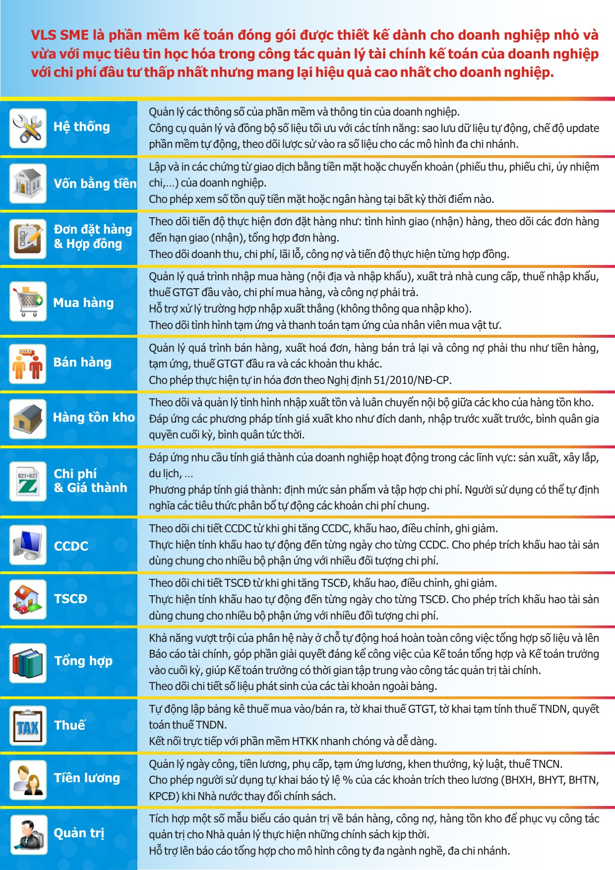 VLS SME 1.0 là sản phẩm quản trị tài chính kế toán nằm trong phân khúc sản phẩm dành cho Doanh nghiệp vừa và nhỏ. Với chi phí đầu tư rất thấp Doanh nghiệp có thể sở hữu ngay sản phẩm phù hợp với mô hình của Doanh nghiệp mình mà không phải lo đầu tư một sản phẩm có giá thành cao nhưng doanh nghiêp không sử dụng hết các chức năng của nó, gây ra lãng phí không cần thiết.